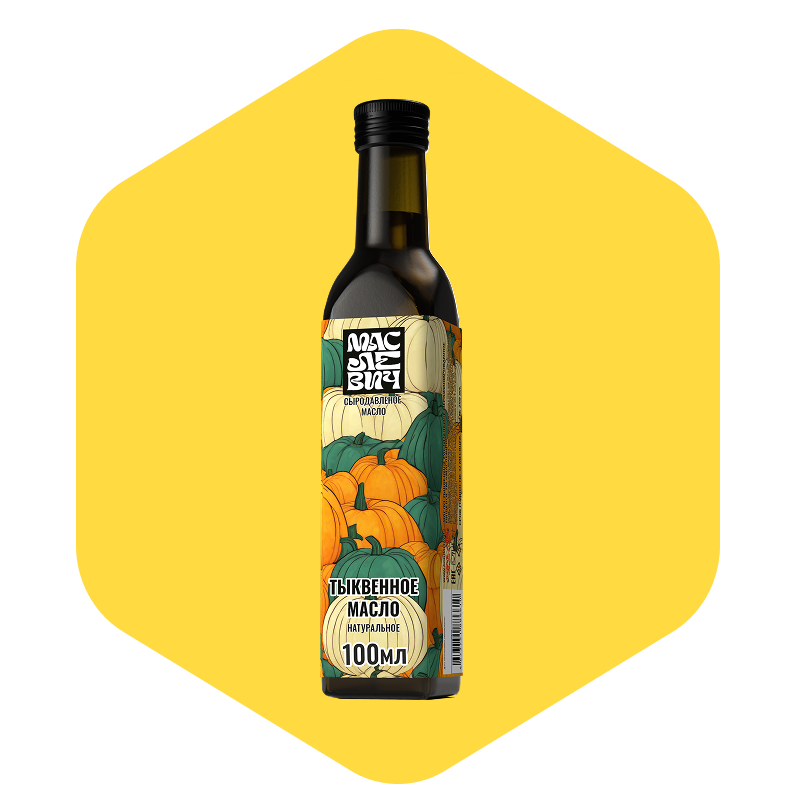 Тыквенное масло холодного отжима в стеклянной бутылке 100/250 мл Тыквенное масло холодного отжима — это природный источник цинка, витаминов A, E, K и жирных кислот Омега-6 и Омега-9. Производится из семян тыквы методом первого холодного отжима, без термической обработки и добавок.