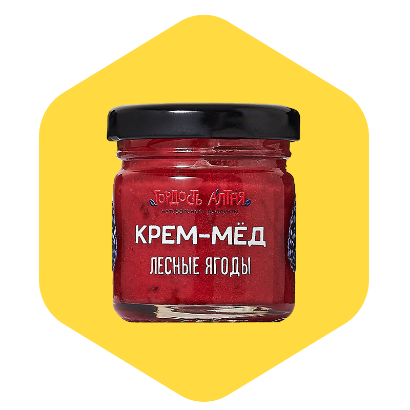 Состав: Крем-мёд (взбитый цветочный мёд из Алтая), натуральные лесные ягоды (малина, черника, земляника и др.)